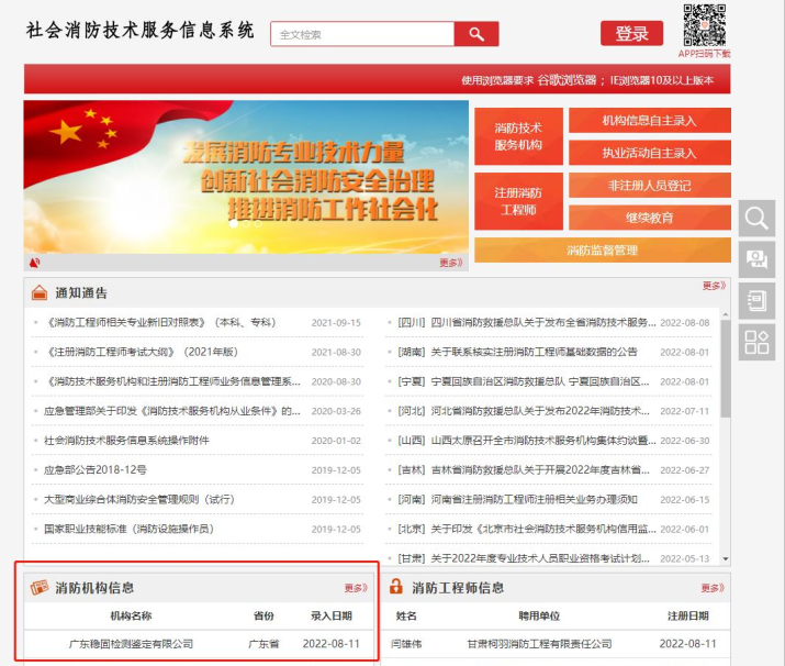 今年8月份,cq9电子在线登录检测公司取得了消防设施维保检测及消防安全评估资质,通过了全国社会消防技术服务信息系统审批并获得了自主录入资格。同时cq9电子在线登录检测公司还被列入广东社会消防技术服务信息平台的省内执业机构名录。