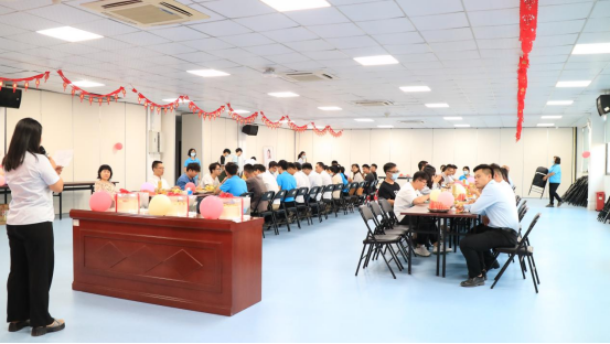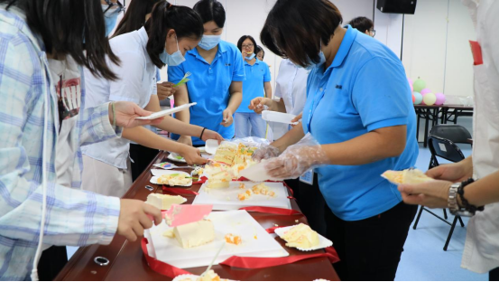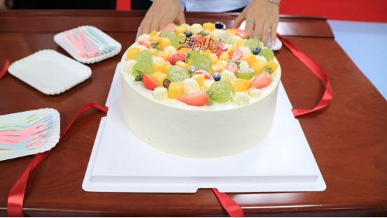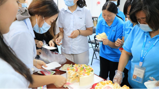 李婉华副总裁还与“寿星”们一起切蛋糕,一起品尝集团公司为大家准备的美味佳肴。