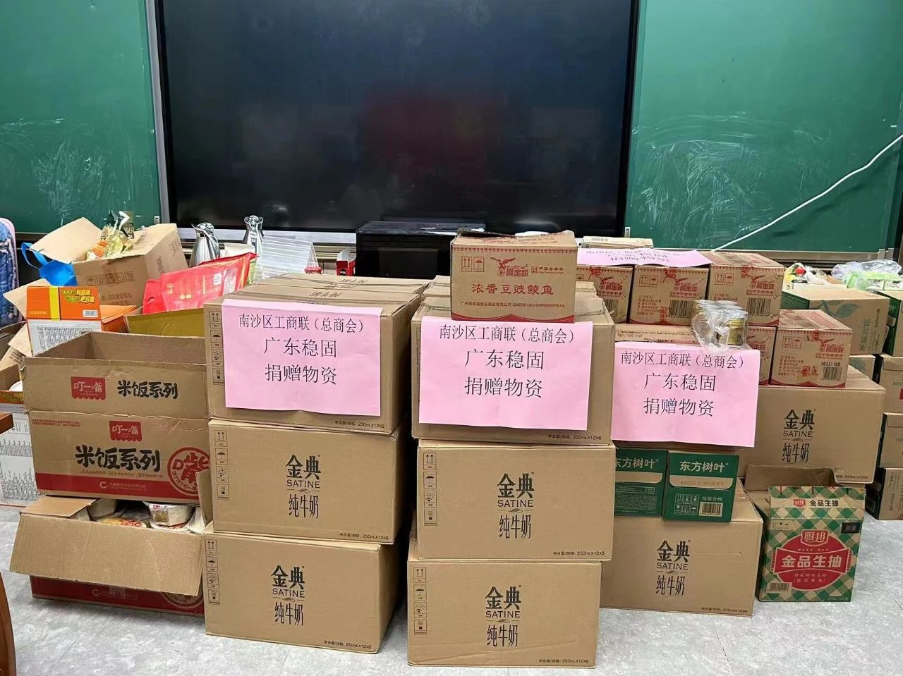 11月26日捐赠物资包含:加厚帽带长风衣2500件、伊利金典纯牛奶200盒、鹰金钱豆豉鲮鱼600罐、老干妈干煸肉丝辣椒120瓶、东方树叶原味茶饮496瓶,价值3万元。